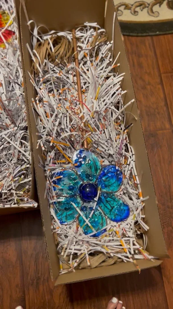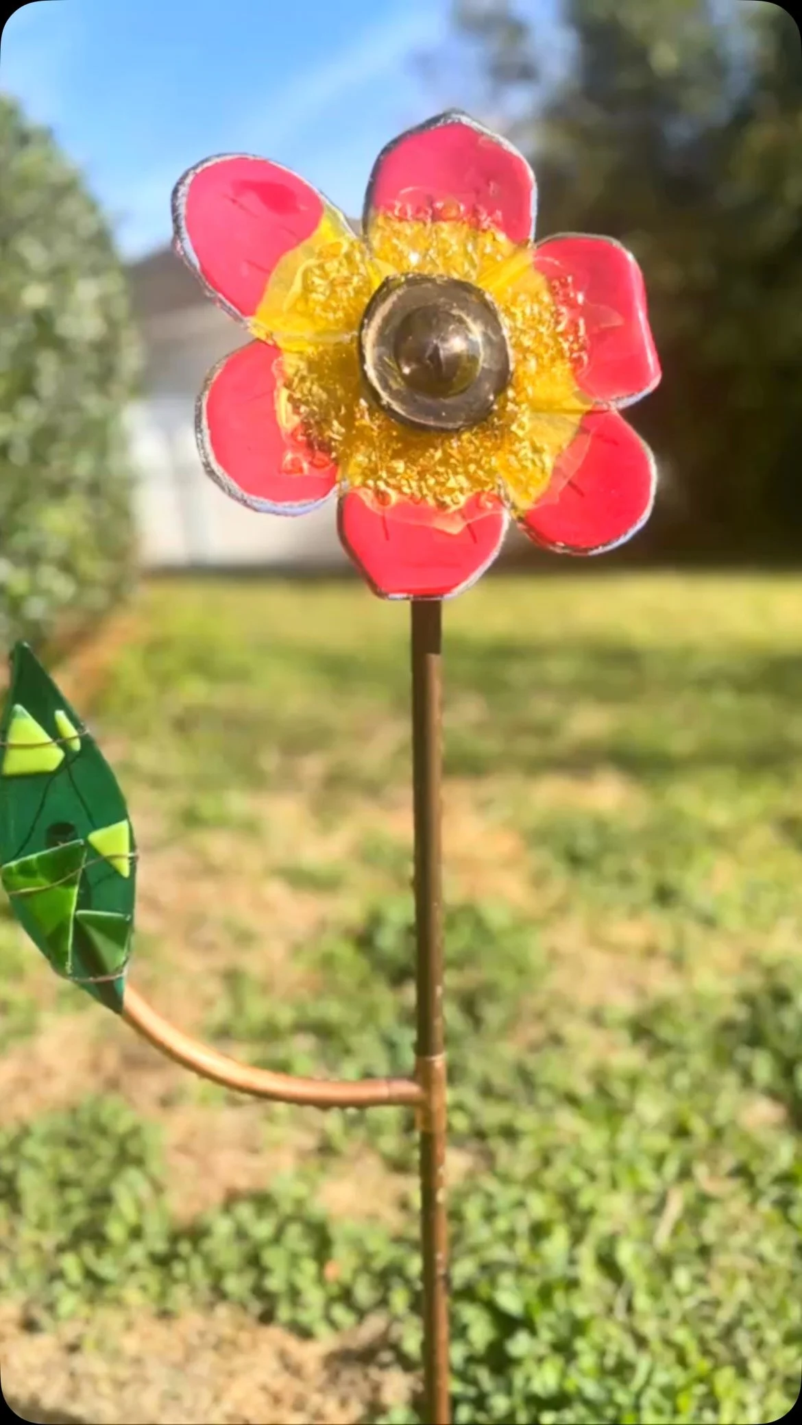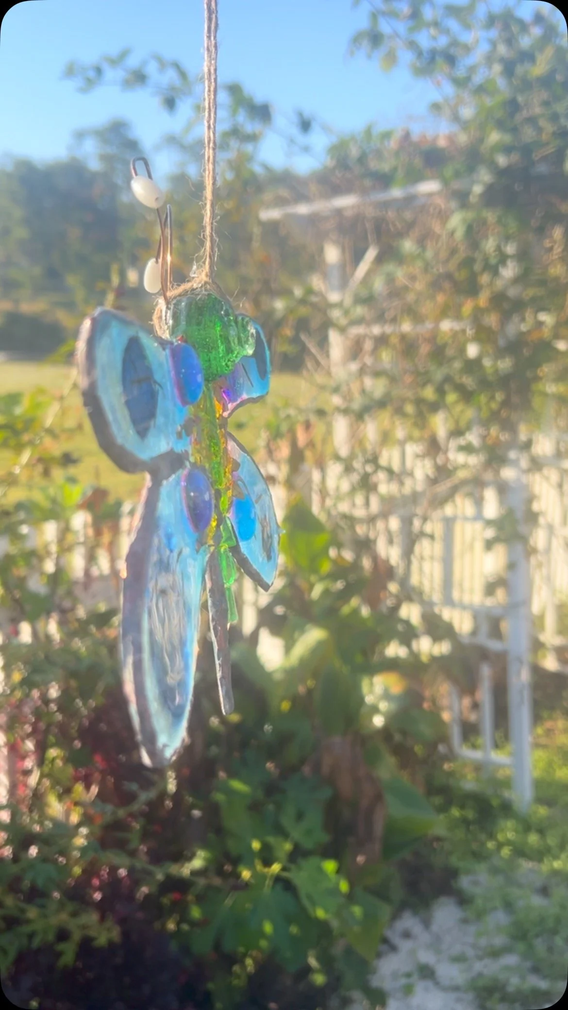 This piece is 27.5 by 27.5 inches framed. It is created with cut glass, acrylic paint, dried flowers and alcohol ink. Hang it ona wall or set it in a window to transform the light coming in.