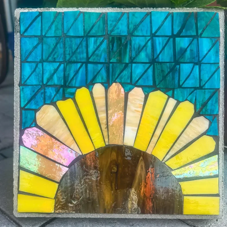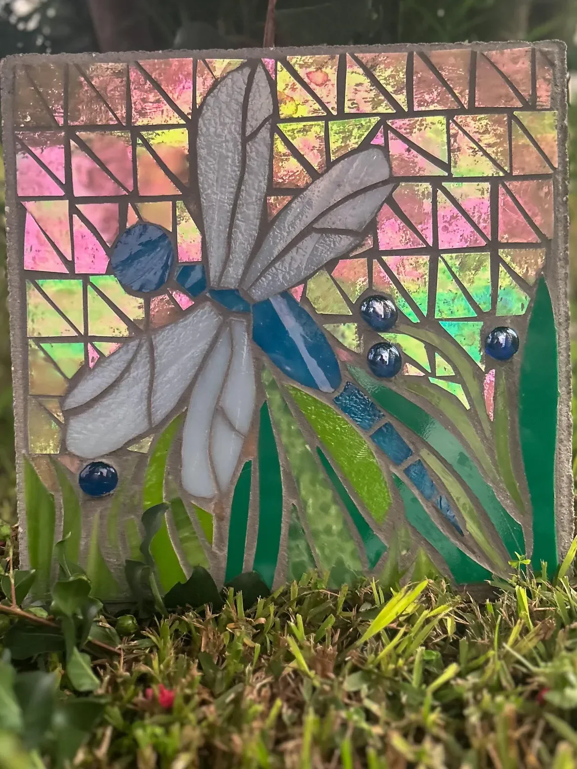 This piece is 27.5 by 27.5 inches framed. It is created with cut glass, acrylic paint, dried flowers and alcohol ink. Hang it ona wall or set it in a window to transform the light coming in.